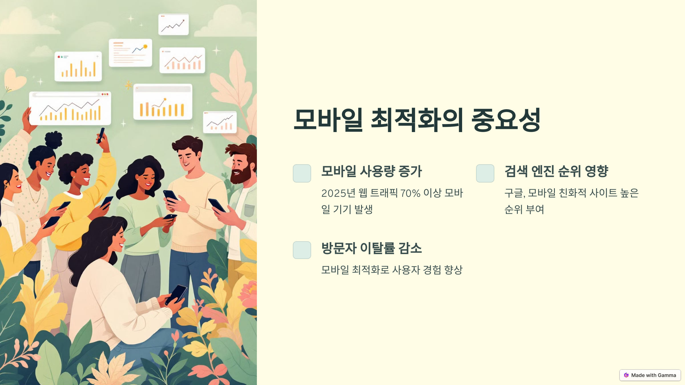 - 모바일 사용량 증가: 2025년 기준, 웹 트래픽의 70% 이상이 모바일 기기에서 발생합니다.